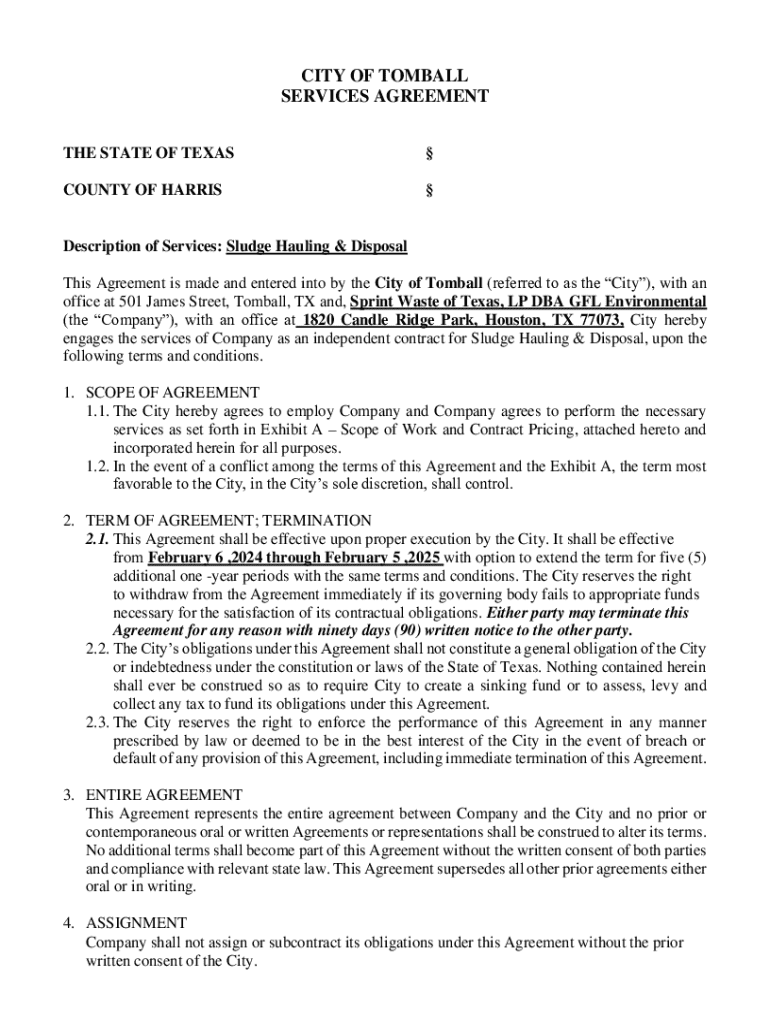 Este acuerdo establece los términos y condiciones bajo los cuales la Ciudad de Tomball contrata los servicios de Sprint Waste of Texas, LP DBA GFL Environmental para la recolección y disposición