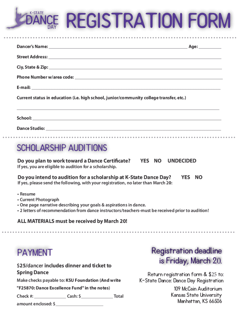 This form is for registering dancers for the K-State Dance Day, including options for scholarship auditions and payment details.