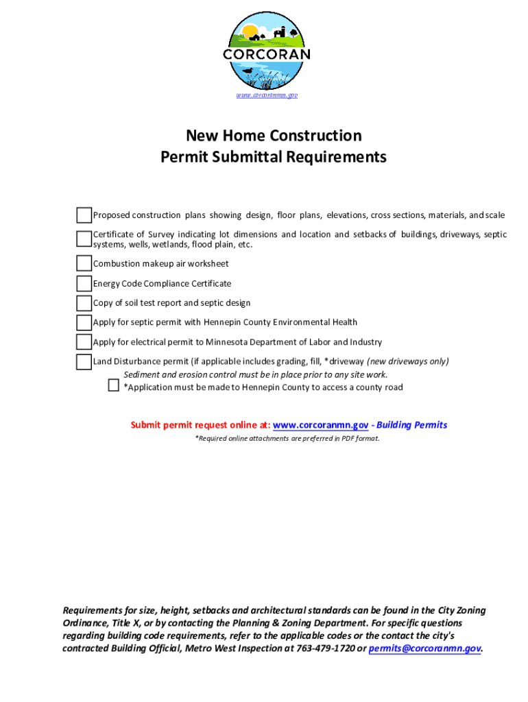 This document outlines the necessary submittal requirements and procedures for obtaining a building permit for new home construction in the City of Corcoran. It details the required documents, additional