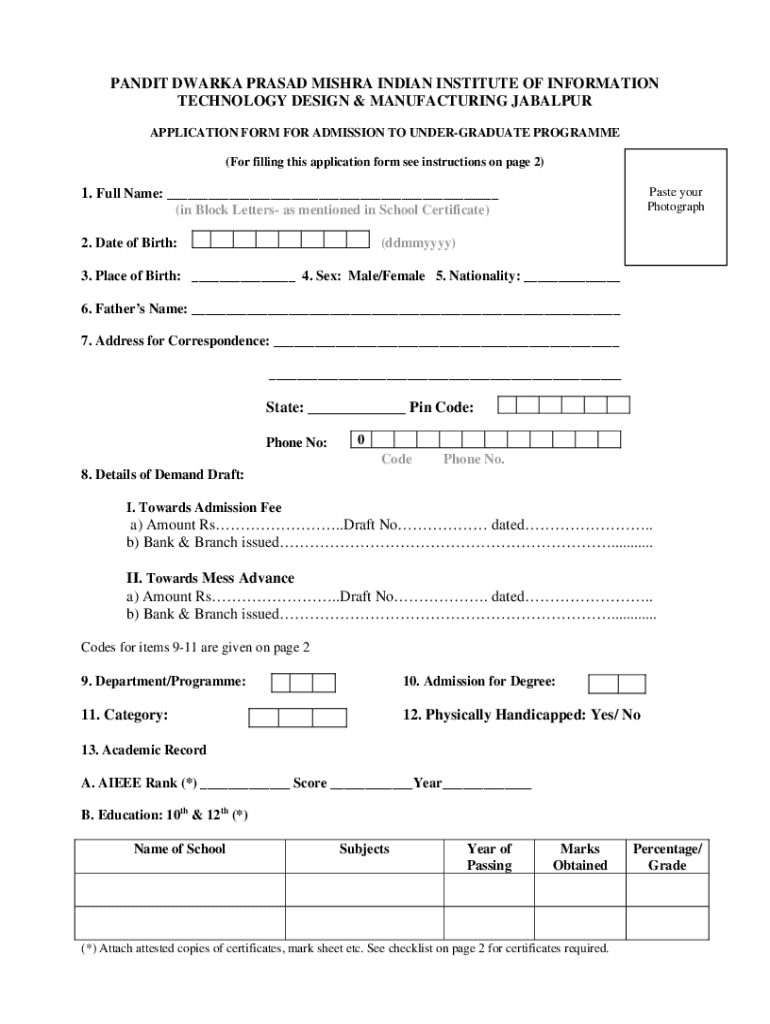 This application form is to be used by candidates seeking admission to the undergraduate programmes at Pandit Dwarka Prasad Mishra Indian Institute of Information Technology Design & Manufacturing