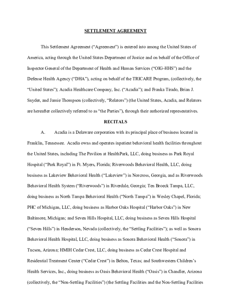 This Settlement Agreement is made between the United States and Acadia Healthcare Company regarding allegations of submitting false claims to Medicare, Medicaid, and TRICARE. The agreement outlines