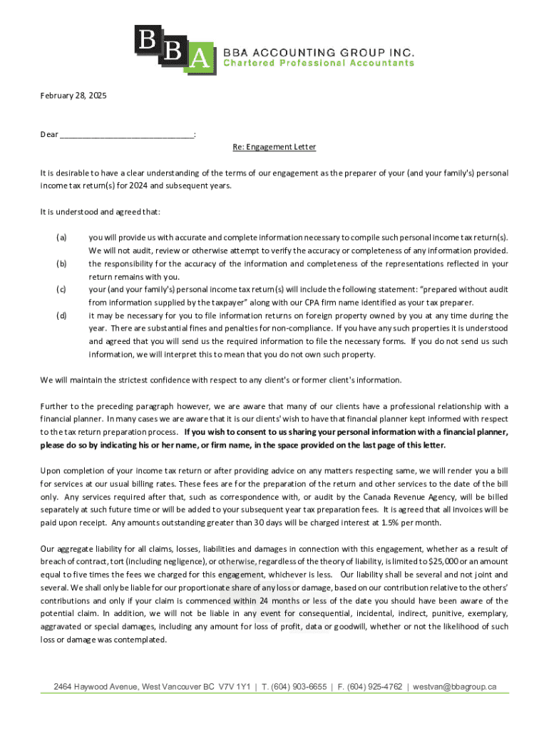 This engagement letter outlines the terms of service for preparing personal income tax returns for the client and their family for 2024 and subsequent years, including responsibilities, confidentiality,
