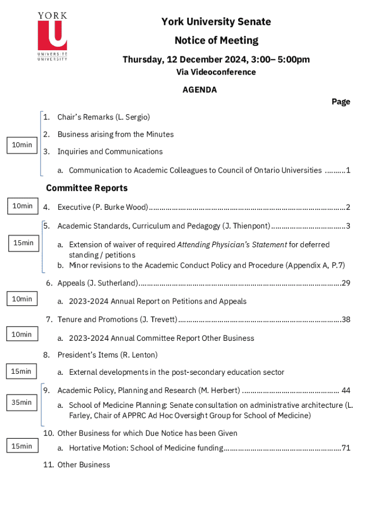York University Senate Notice of Meeting Thursday, 12 December 2024, 3:00 5:00pm Via Videoconference AGENDAPage1. Chairs Remarks (L. Sergio) 2. Business arising from the Minutes 10min3. Inquiries