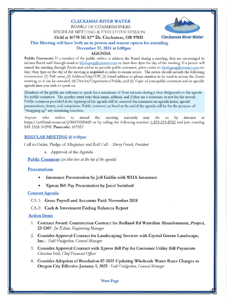 CLACKAMAS RIVER WATER BOARD OF COMMISSIONERS REGULAR MEETING & EXECUTIVE SESSION Held at 16770 SE 82nd Dr. Clackamas, OR 97015 Clackamas River Water This Meeting will have both an in person and remote