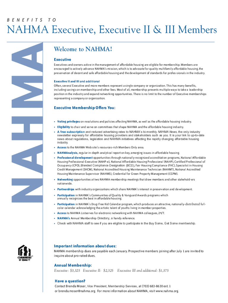 This document provides information about membership in NAHMA for executives and owners involved in affordable housing management. It outlines the benefits of joining, including voting rights, committee