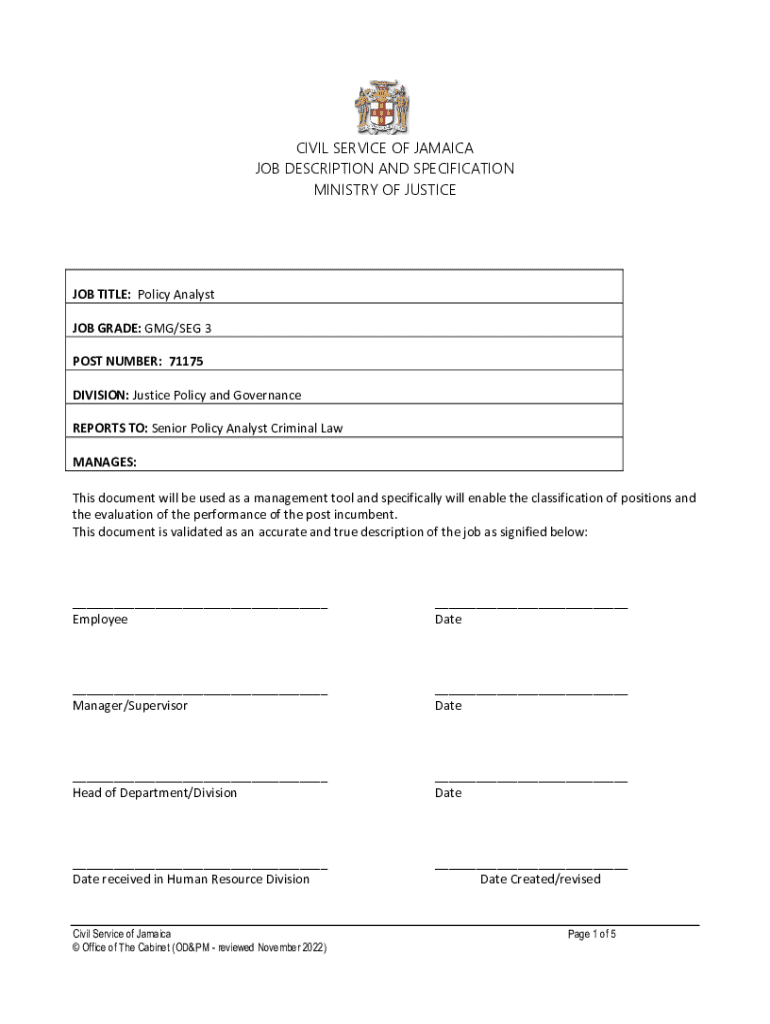 CIVIL SERVICE OF JAMAICA JOB DESCRIPTION AND SPECIFICATION MINISTRY OF JUSTICEJOB TITLE: Policy Analyst JOB GRADE: GMG/SEG 3 POST NUMBER: 71175 DIVISION: Justice Policy and Governance REPORTS TO: