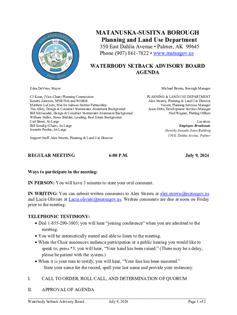 This document outlines the agenda for the Waterbody Setback Advisory Board meeting scheduled for July 9, 2024, including details of participants, items of business, and ways to provide public comments.