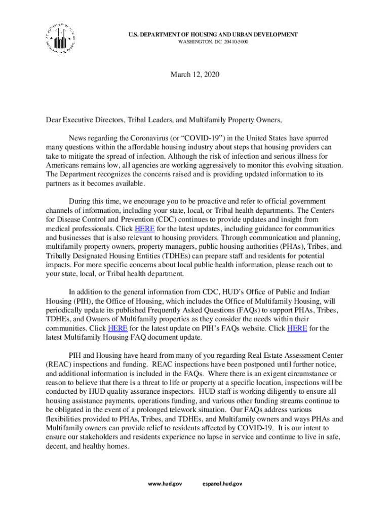 U.S. DEPARTMENT OF HOUSING AND URBAN DEVELOPMENT WASHINGTON, DC 204105000March 12, 2020Dear Executive Directors, Tribal Leaders, and Multifamily Property Owners, News regarding the Coronavirus (or