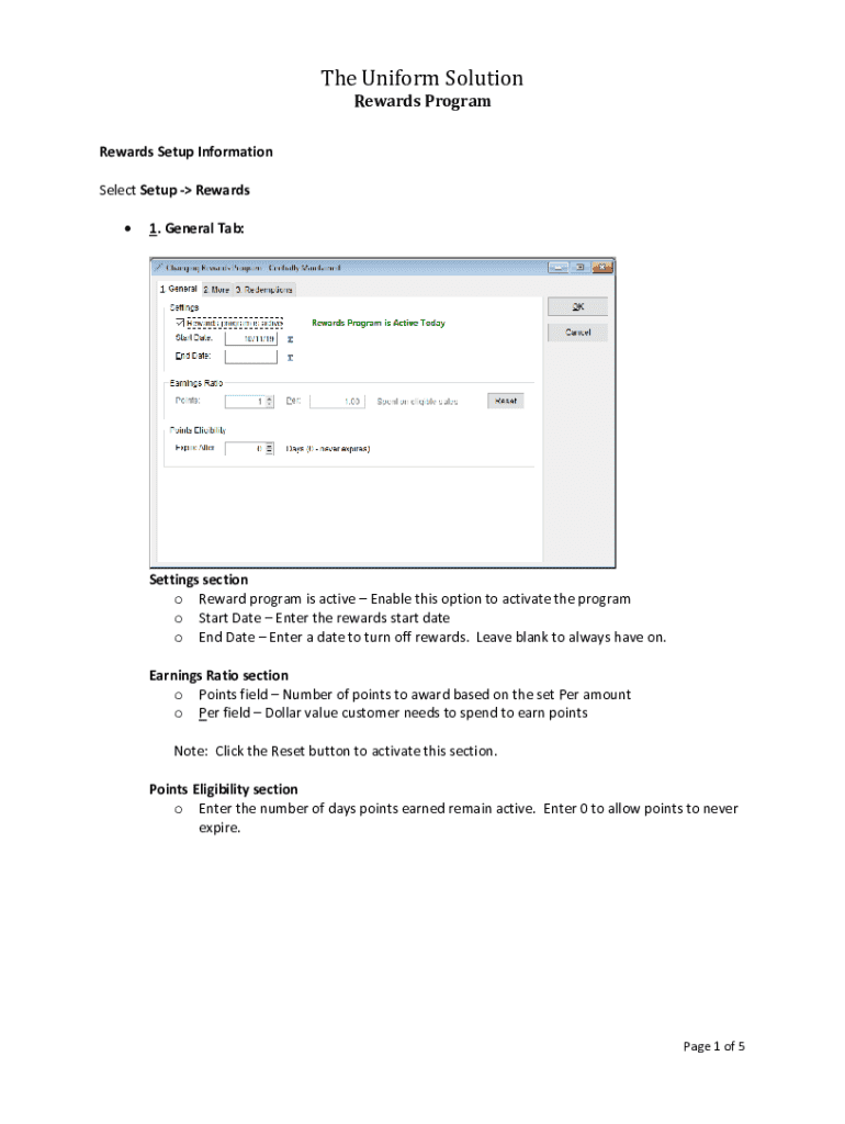 The Uniform Solution Rewards ProgramRewards Setup Information Select Setup Rewards 1. General Tab:Settings section o Reward program is active Enable this option to activate the program o Start Date