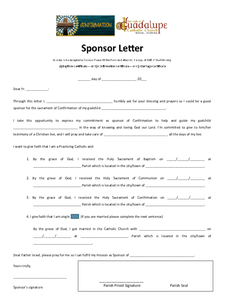 ___ day of ___ 20___ Dear Fr. ___: Through this letter I, ___ humbly ask for your blessing and prayers so I could be a good sponsor for the sacrament of Confirmation of my godchild ___. I take this