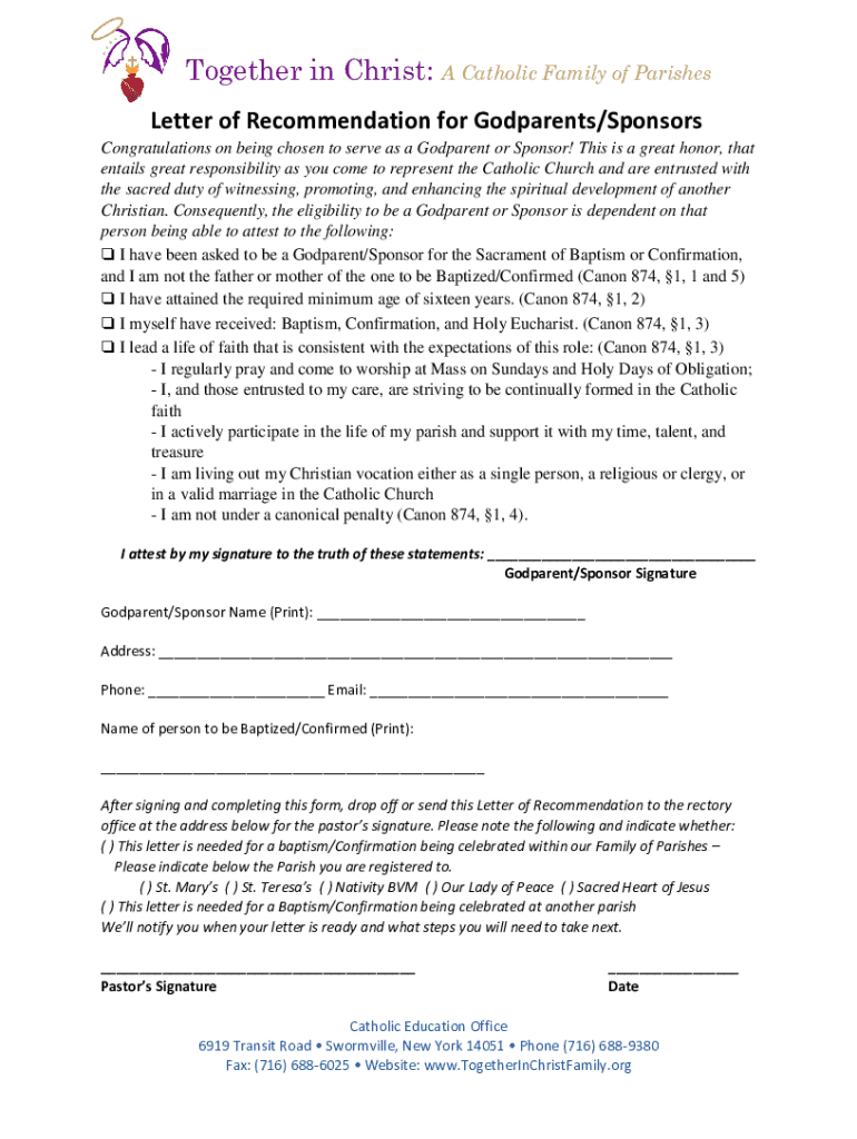 Get the free Letter of Recommendation for Godparents/sponsors