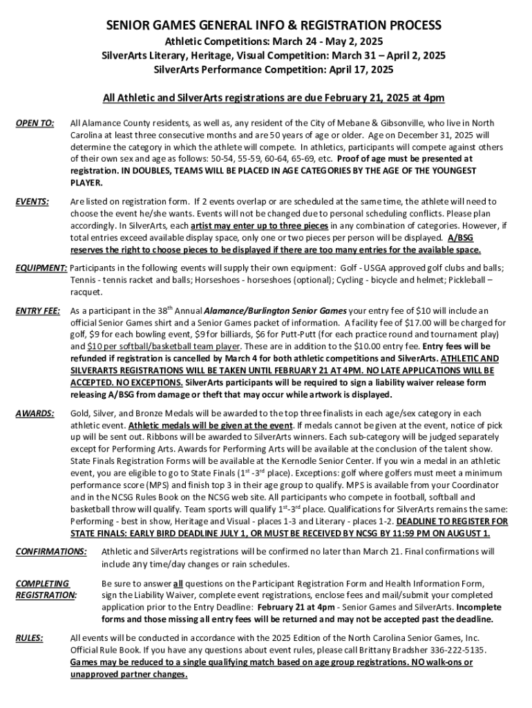 Este documento proporciona información general sobre los Juegos Senior de Alamance/Burlington, incluyendo el proceso de registro, las fechas de los eventos, requisitos de participación, tarifas
