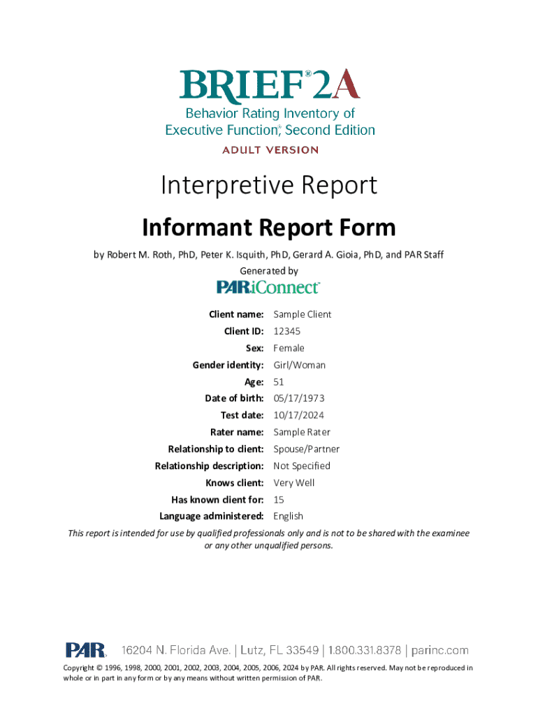 The BRIEF2A is a standardized rating scale designed to provide insights into everyday behaviors associated with executive functioning in adults. This report summarizes the ratings and scores from