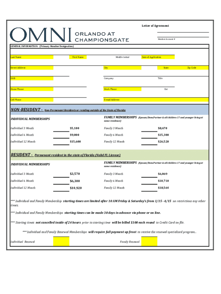 Este documento es un Acuerdo de Membresía que detalla las condiciones, tarifas y beneficios de ser miembro en el ChampionsGate Golf Club. Incluye información sobre membresías individuales y familiares,