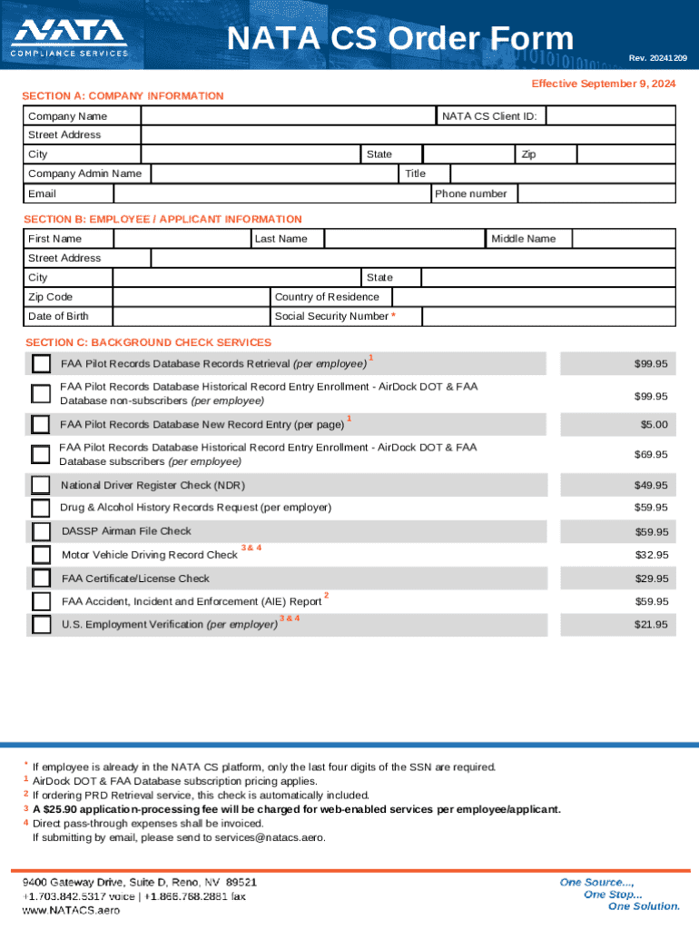 To fill out the NATA CS order form, provide the required details such as contact information, service specifications, and any relevant account numbers, then submit it according to the instructions.