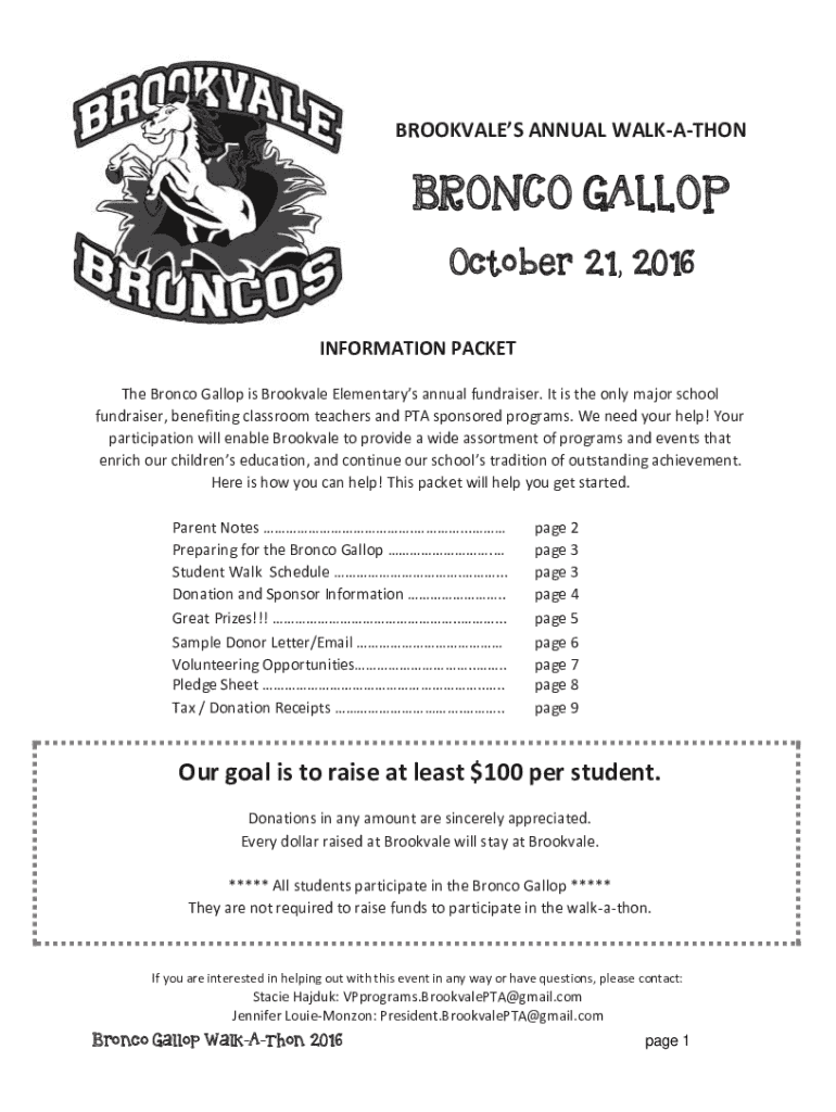 This information packet for the Bronco Gallop outlines the details of Brookvale Elementary’s annual fundraiser, aimed at supporting classroom teachers and PTA programs. It includes preparation tips