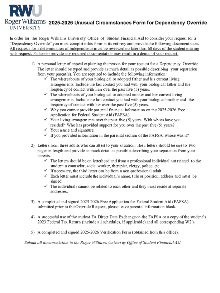 This form is used by students at Roger Williams University to request a Dependency Override for financial aid purposes. Students must provide detailed personal information, documentation, and third-party