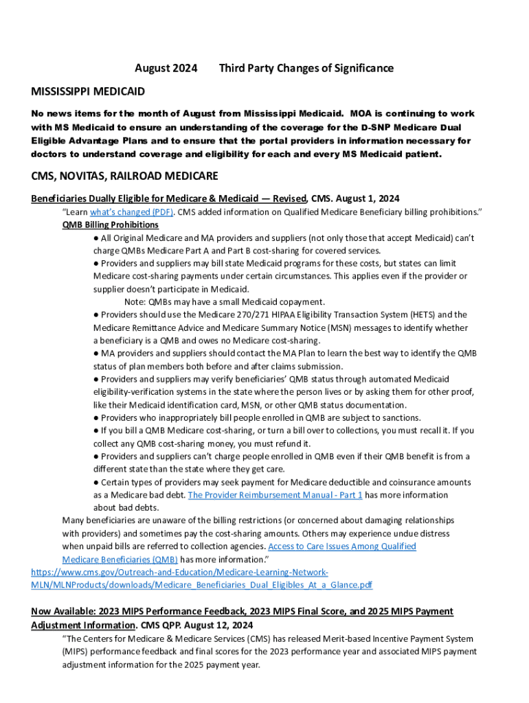 August 2024Third Party Changes of SignificanceMISSISSIPPI MEDICAID No news items for the month of August from Mississippi Medicaid. MOA is continuing to work with MS Medicaid to ensure an understanding