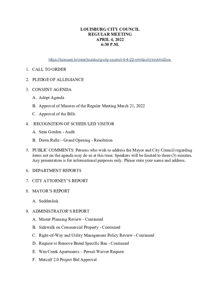 LOUISBURG CITY COUNCIL REGULAR MEETING APRIL 4, 2022 6:30 P.M. https://boxcast.tv/view/louisburgcitycouncil4422vmntzcrrjrxvdvhd2iox1. CALL TO ORDER 2. PLEDGE OF ALLEGIANCE 3. CONSENT AGENDA A. Adopt