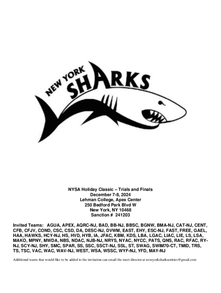 The NYSA Holiday Classic is a competitive swimming event held at Lehman College\'s Apex Center in New York, featuring Trials and Finals for various age groups, with specific eligibility criteria and