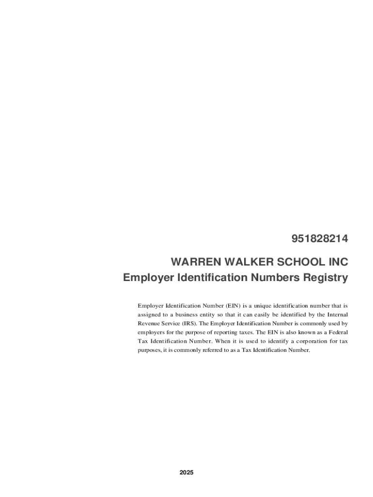 951828214 WARREN WALKER SCHOOL INC Employer Identification Numbers Registry Employer Identification Number (EIN) is a unique identification number that is assigned to a business entity so that it