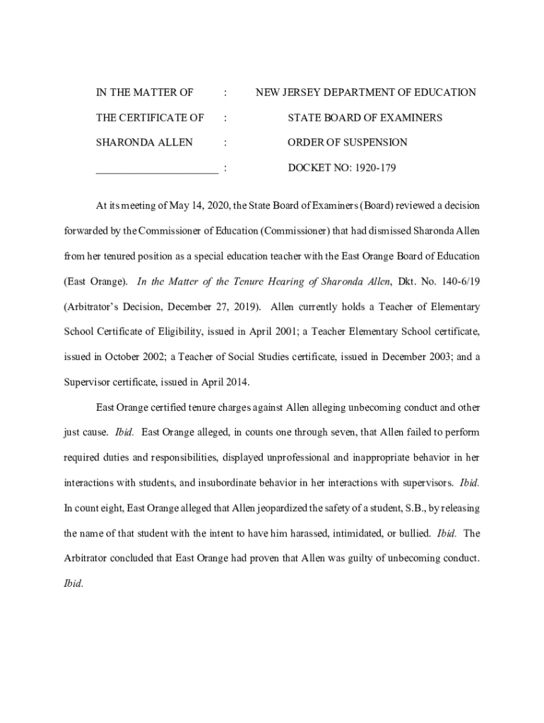 IN THE MATTER OF:NEW JERSEY DEPARTMENT OF EDUCATIONTHE CERTIFICATE OF:STATE BOARD OF EXAMINERSSHARONDA ALLEN:ORDER OF SUSPENSION___ :DOCKET NO: 1920179At its meeting of May 14, 2020, the State Board