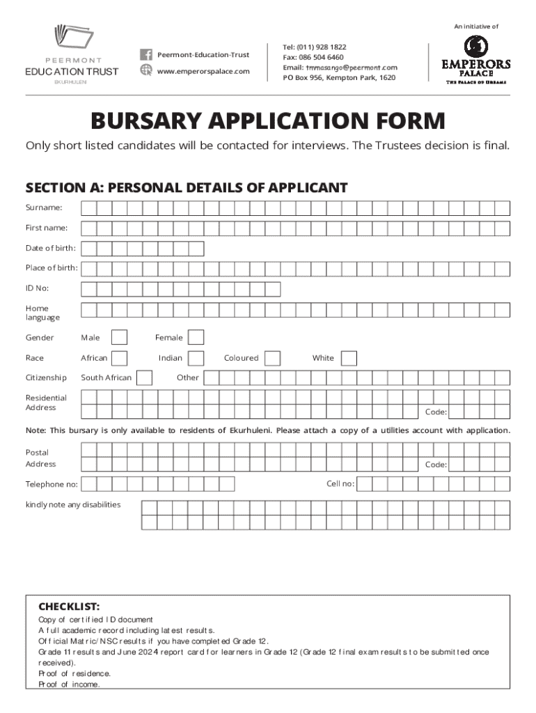 This form is designed for applicants seeking financial assistance through the Peermont Education Trust bursary program, available exclusively to residents of Ekurhuleni. The form collects personal