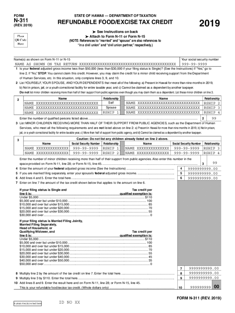 Use Form N-311 to figure and claim the refundable food/excise tax credit under section 235-55.85, Hawaii Revised Statutes (HRS). This form is for taxpayers filing individual income tax returns, including