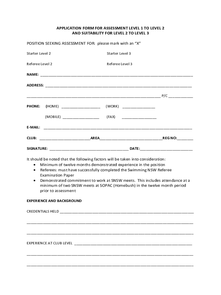 This application form is intended for individuals seeking assessment for progression from Level 1 to Level 2 and suitability for Level 2 to Level 3 positions within Swimming NSW. It requires personal