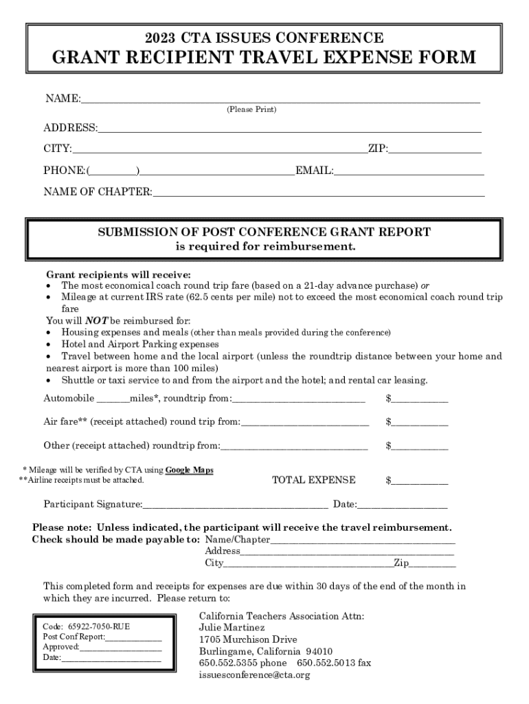 This form is used by grant recipients to request reimbursement for travel expenses incurred while attending the 2023 CTA Issues Conference. It outlines what expenses are eligible for reimbursement