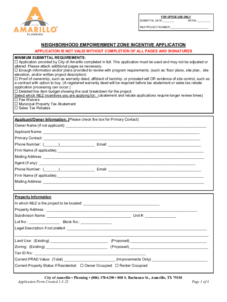 This application is required for projects located within the Neighborhood Empowerment Zone in Amarillo, TX. It includes details about the applicant, property, project type, and necessary documentation