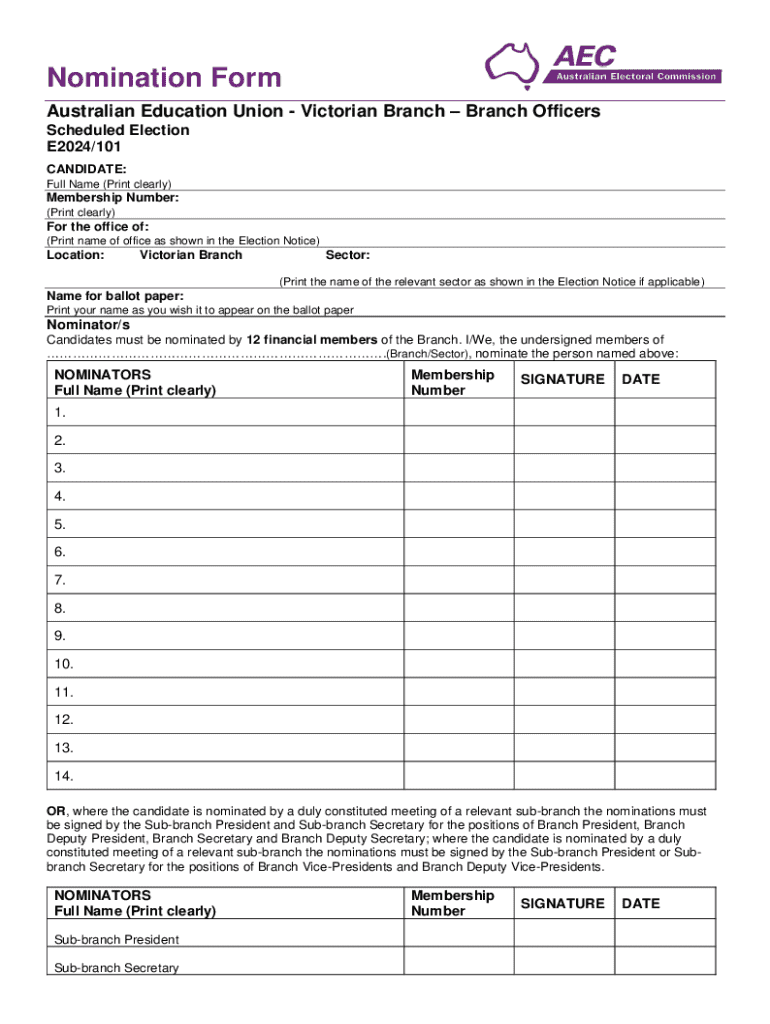 This nomination form is used for candidates seeking election for branch officer positions within the Australian Education Union - Victorian Branch. It requires candidates to provide personal details,