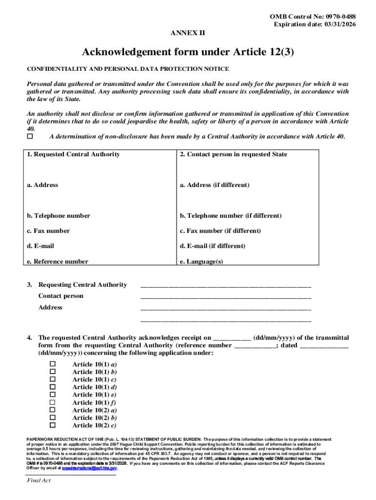 This form is utilized to acknowledge the receipt of a transmittal form concerning applications under the Hague Child Support Convention and ensures confidentiality and proper processing of personal