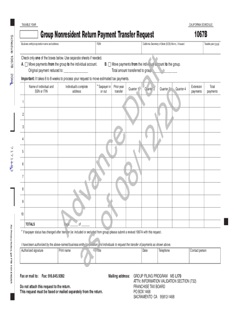 This form is used to request the transfer of estimated tax payments between group and individual accounts for nonresident taxpayers in California. It includes sections for personal and business information,