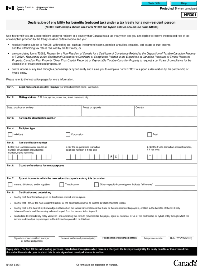 Non-residents of Canada who receive income that may be subject to withholding tax and wish to claim a reduced rate or exemption based on a tax treaty between their home country and Canada are required to file NR301.