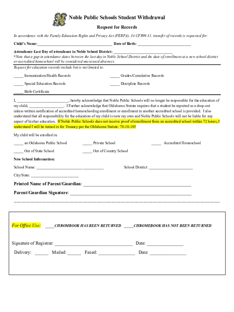 This document is a request for the transfer of education records for a child withdrawing from Noble Public Schools, in accordance with FERPA regulations. It includes sections for the child\'s details,