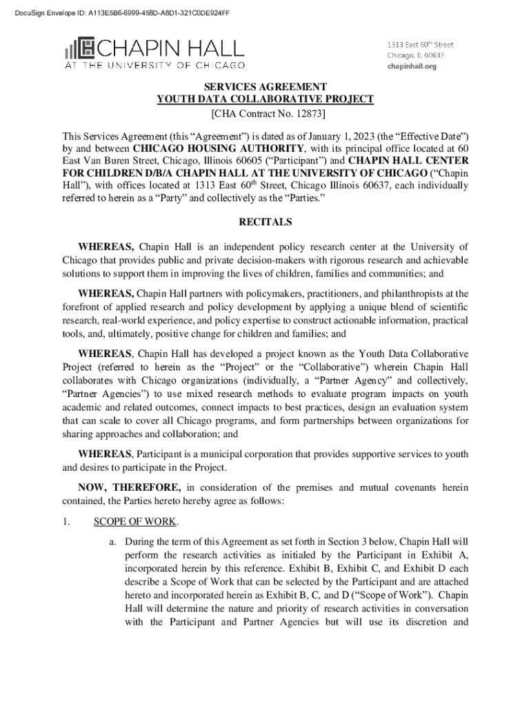 This Services Agreement outlines the partnership between the Chicago Housing Authority and Chapin Hall Center for Children for the Youth Data Collaborative Project, aimed at improving outcomes for