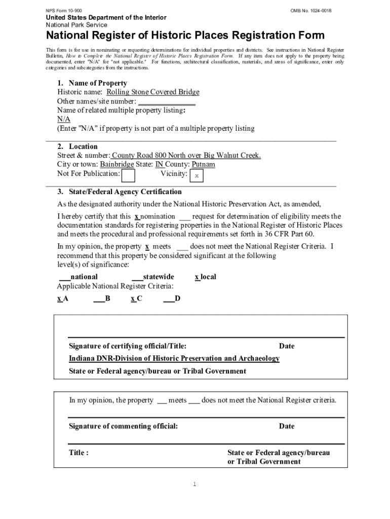 This form is for use in nominating or requesting determinations for individual properties and districts, specifically for the Rolling Stone Covered Bridge in Putnam County, Indiana.