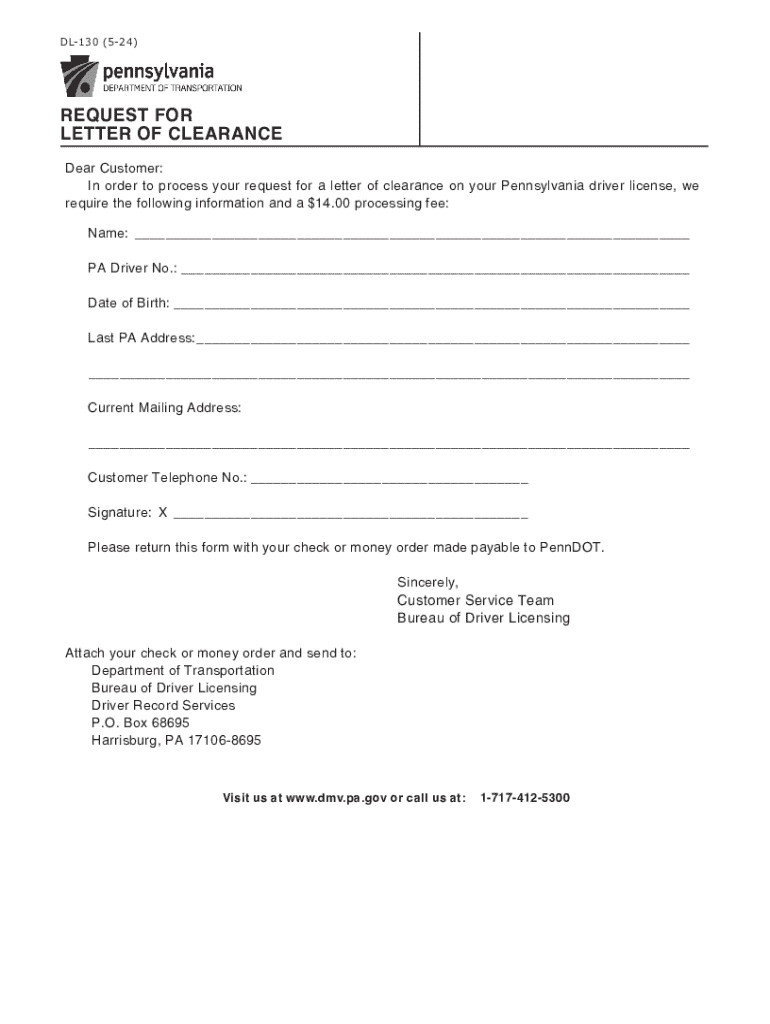 This form is used to request a letter of clearance for a Pennsylvania driver license. It requires personal information and a processing fee.