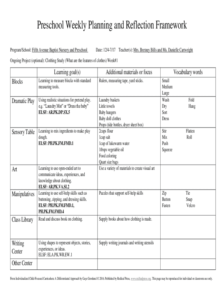 Get the free Preschool Weekly Planning and Reflection Framework