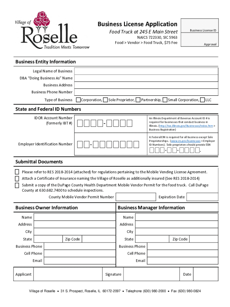This document serves as an application for a Business License specifically for a food truck operating at 245 E Main Street. It outlines the necessary business entity information, required documentation,