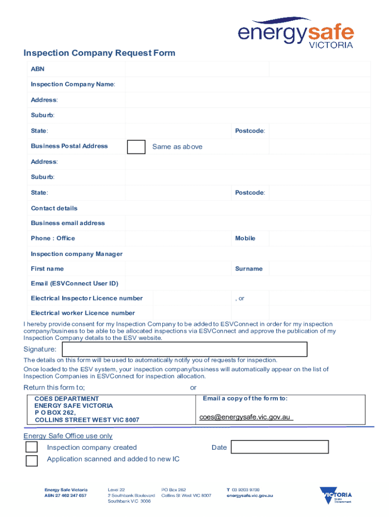 This form is used to request the addition of an inspection company to the ESVConnect system, allowing the company to be allocated inspections and publish its details on the ESV website.