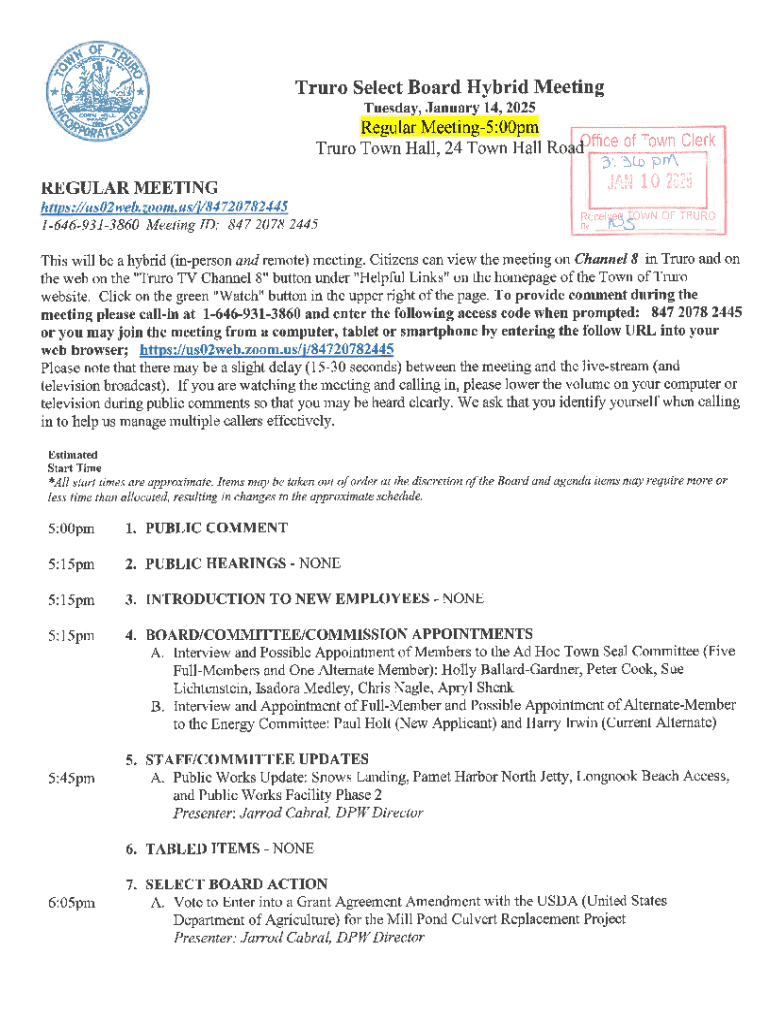 Agenda Item: 4ATOWN OF TRUROSelect Board Agenda ItemDEPARTMENT: Administration REQUESTOR: Darrin Tangeman, Town Manager REQUESTED MEETING DATE: January 14, 2025 ITEM: Interview and Possible Appointment