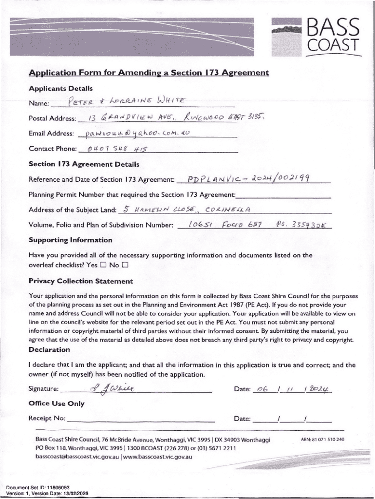 Get the free Application Form for Amending a Section 173 Agreement