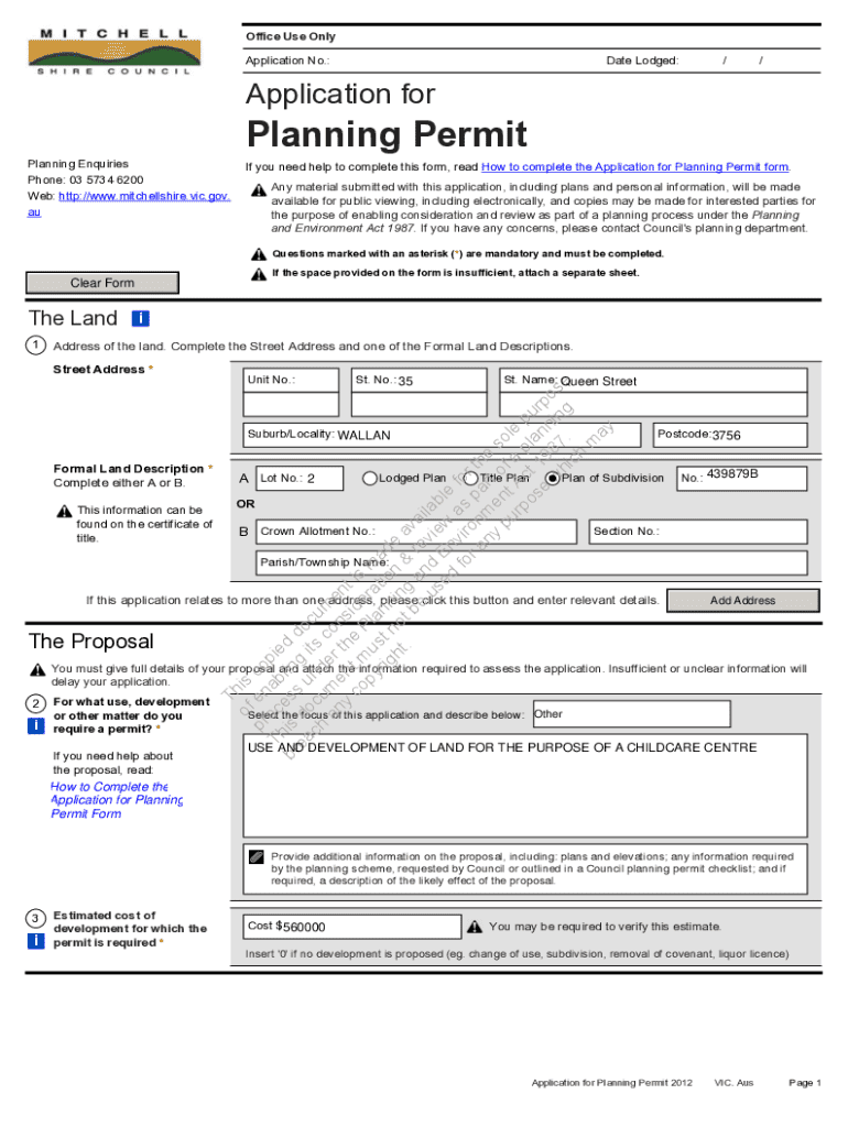 This form is used to apply for a planning permit in accordance with the Planning and Environment Act 1987. It includes sections for providing details about the land, the proposal for development,