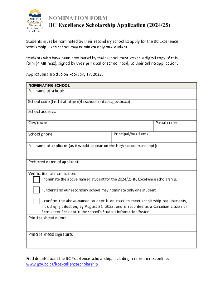 Este formulario es para nominar a un estudiante para la beca BC Excellence. Cada escuela secundaria puede nominar solo a un estudiante y debe adjuntar una copia digital firmada por el director a la