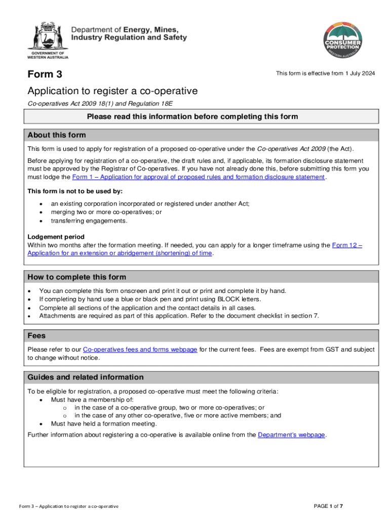 Este formulario se utiliza para solicitar el registro de una cooperativa propuesta bajo la Ley de Cooperativas de 2009. Antes de solicitar el registro, las reglas del proyecto y, si corresponde, la
