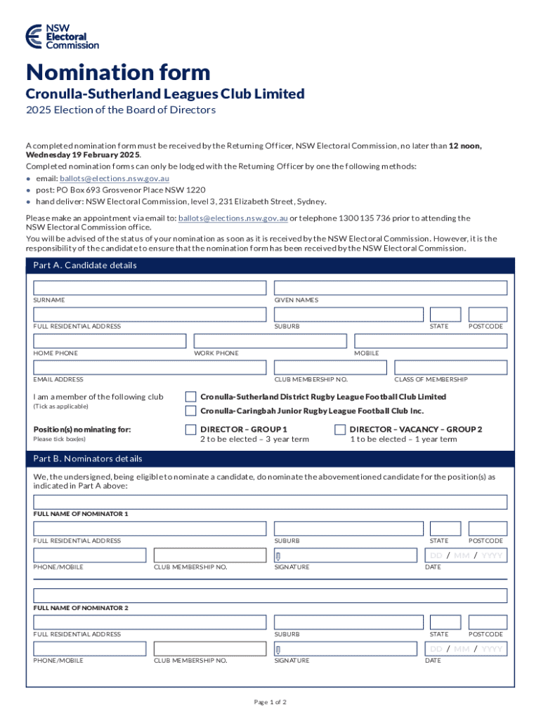 Este formulario de nominación es para los candidatos que desean postularse para el Consejo de Directores de Cronulla-Sutherland Leagues Club Limited en las elecciones de 2025. Los candidatos deben