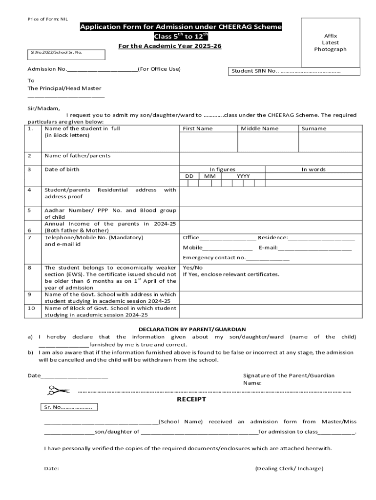 This application form is for students seeking admission from Class 5th to 12th under the CHEERAG Scheme for the academic year 2025-26. It includes fields for personal details, family information,