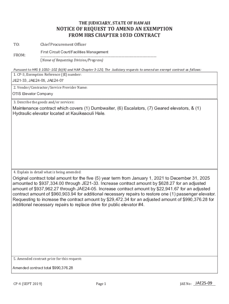 This document serves as a formal request to amend an exempt contract related to maintenance services for various types of elevators, escalators, and dumbwaiters at Kauikeaouli Hale. It outlines details